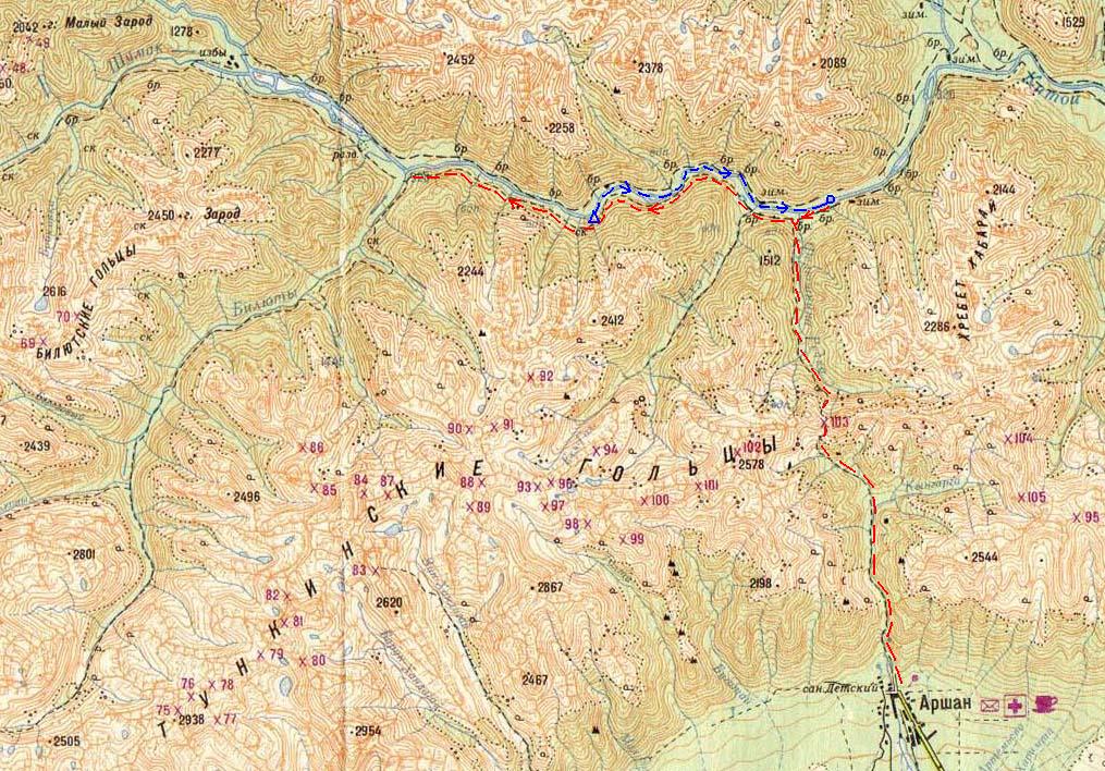 пос. Аршан - пер. Аршан - Федюшкина речка - р. Китой - устье р. Билюты - сплав по р. Китой до Федюшкиной речки - пер. Аршан - пос. Аршан