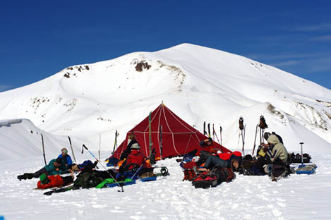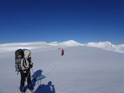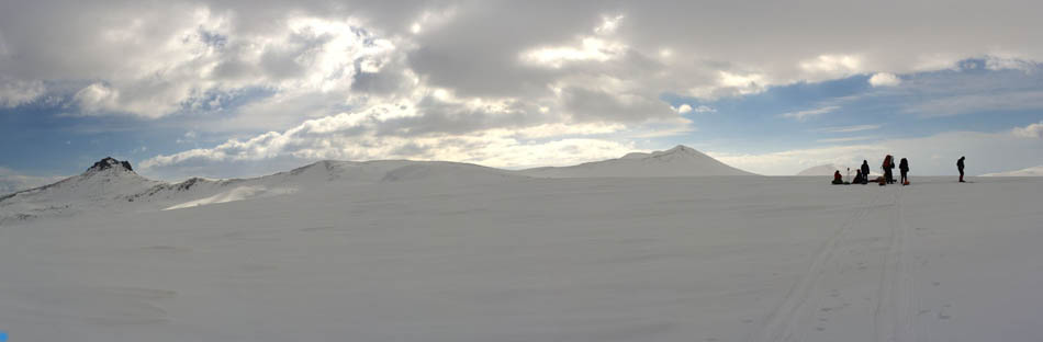 спустились пологими траверсами на лыжах практически на восток и встали на обед на широком платообразном участке южного склона.