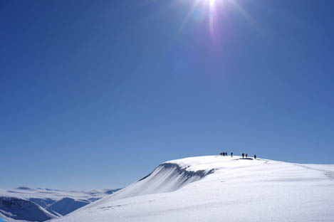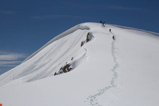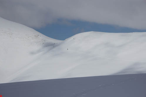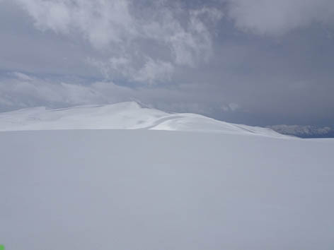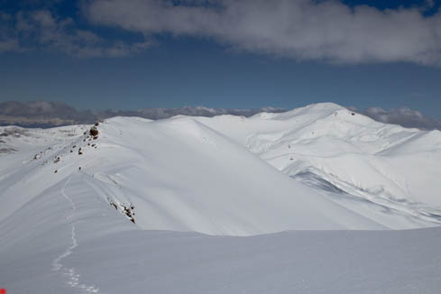 Гребень в этом месте достаточно широк, вправо на юг уходят не очень крутые склоны, слева на север – крутые склоны с карнизами.