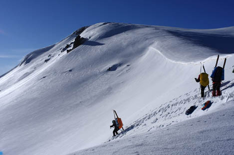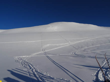 Мы не видели следов лавин, не считая упавших фрагментов карнизов на солнечных склонах.