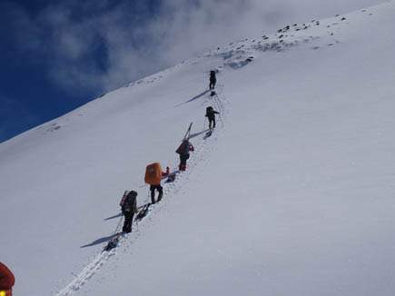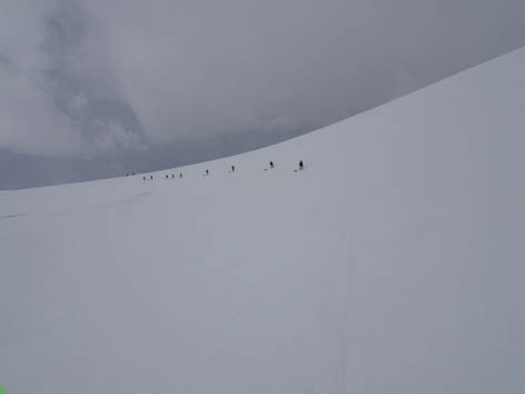 обвязок и карабинов не могли организовать надежную страховку. В результате мы обошли этот участок гребня по западному склону.
