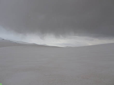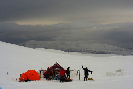 Пока ставили лагерь, пошел снег-крупа, больше похожий на мелкий град. Потом мокрый снег. Видимость 200-300 м.
