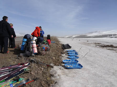 В 10 утра за нами заехал микроавтобус и повез нас на Селимский перевал. Выгрузили рюкзаки, лыжи и санки.