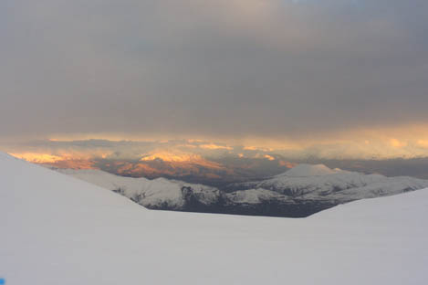 расположенных вдоль гребня на расстоянии 50-100 м друг от друга. Пока ставили лагерь, любовались освещенными закатом горами на юге.